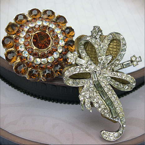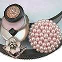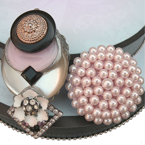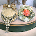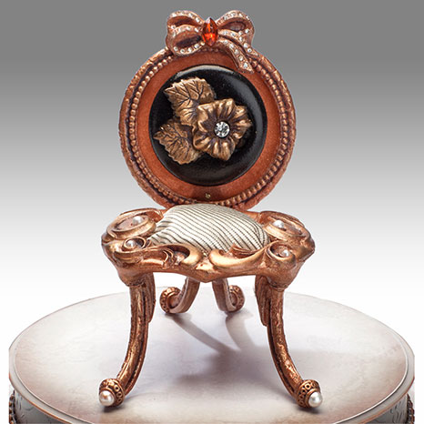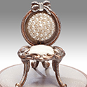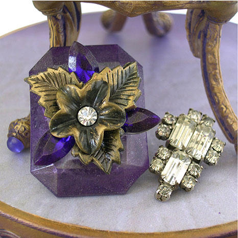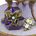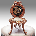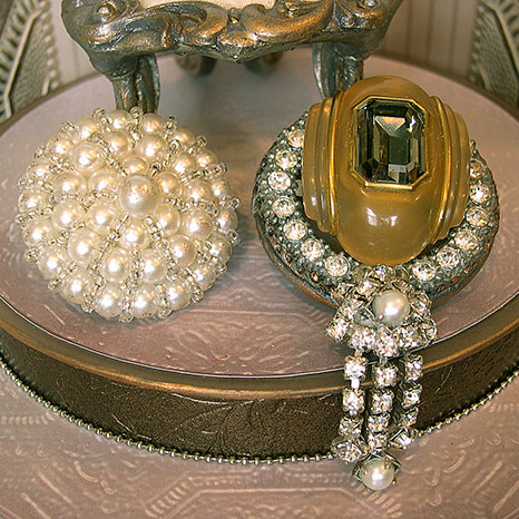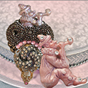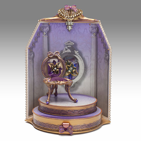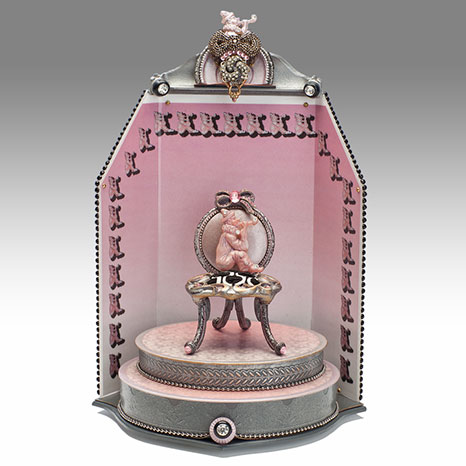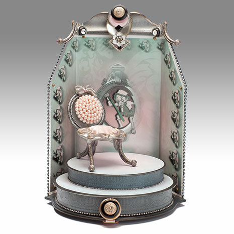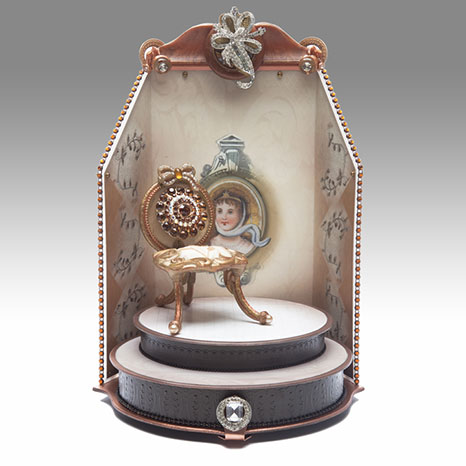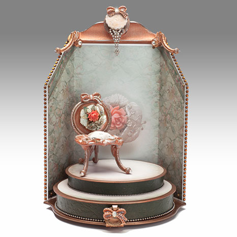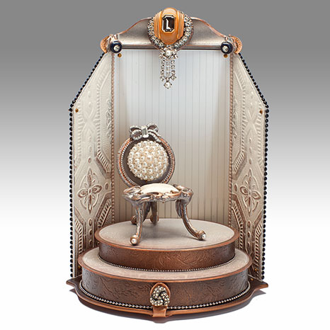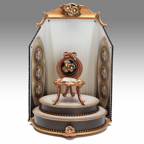Miniature handmade theatres, with 2 camouflaged detachable pieces of unique jewelry. Oftentimes I invent intriguing worlds of misplaced objects, where suspended & dissolving images present riddles about: real & illusion / serious & playful / traditional & high tech / antique & contemporary / fine or applied art. Mixed media: Plastics, vintage parts, digital photo backdrops, faux paint (12” high)